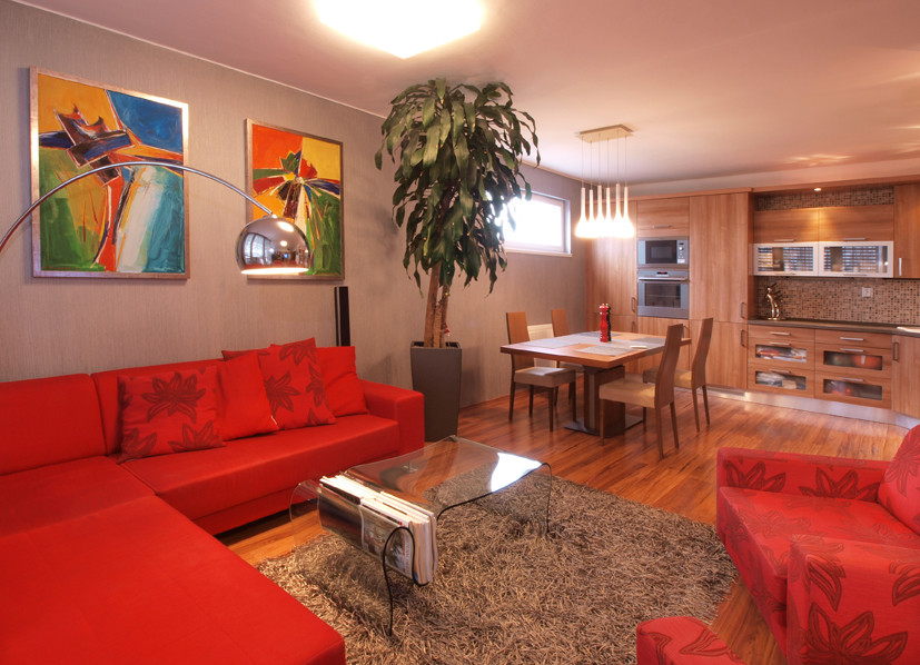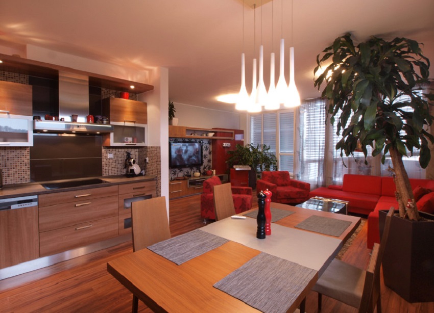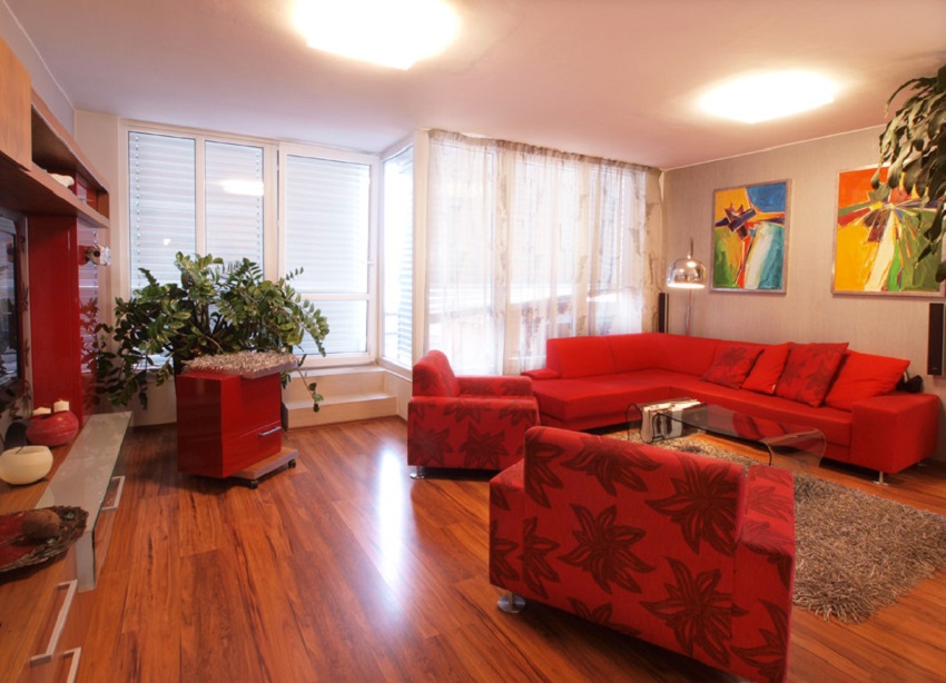 Když půjdete dál, vejdete do prostorného obývacího pokoje, který je spojený s kuchyní a jídelnou. Celkově je tento byt sladěn do červené barvy, a tak není divu, že i gauč, křesla a většina nábytku jsou červené. Celá tato místnost je osvětlena LED panely a nad jídelním stolem visí velký lustr.