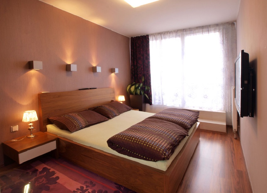 Nyní se dostanete do ložnice, která slouží především k dobrému odpočinku. Nachází se v ní na míru vyrobená šatní skříň, velká dřevěná postel a noční stolky. Nad postelí jsou umístěna čtyři LED světla ve tvaru krychle, jež večer dokážou opravdu příjemně osvítit celý pokoj. A samozřejmě nesmí chybět velká televize. Z ložnice se poté dostanete na terasu, která je skvostem celého bytu.