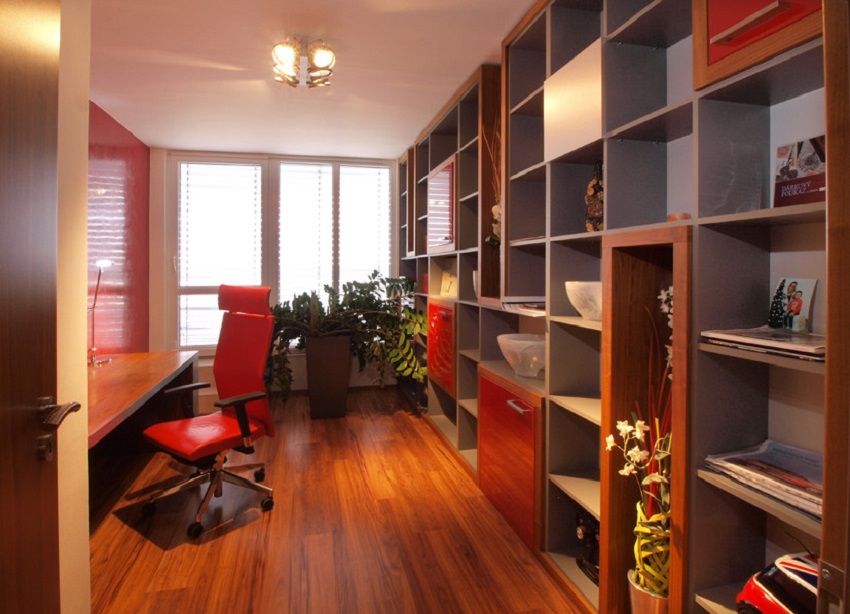 Za zmínku stojí i pracovna, v níž se nachází členitá knihovna, která poskytuje velké množství úložného prostoru. Také je v ní umístěn trezor. Knihovna je laděna do šedé barvy, ale je doplněna výraznou červenou barvou. Vedle pracovny se nachází dětský pokoj, který může být jak pro chlapce, tak pro dívku.