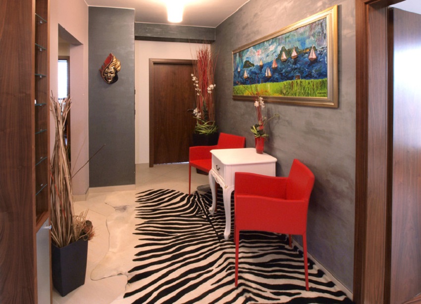 Jakmile vstoupíte do bytu, rozhodně vás jako první zaujme velice prostorná předsíň, v níž se nachází bílý stolek se dvěma červenými křesílky. Nad stolem visí velký obraz a celkově na vás předsíň bude působit luxusním dojmem. Velice zajímavý je také koberec, na němž stolek a křesla stojí. Je důležité zmínit, že šatní skříně byly vytvořeny přímo na míru.